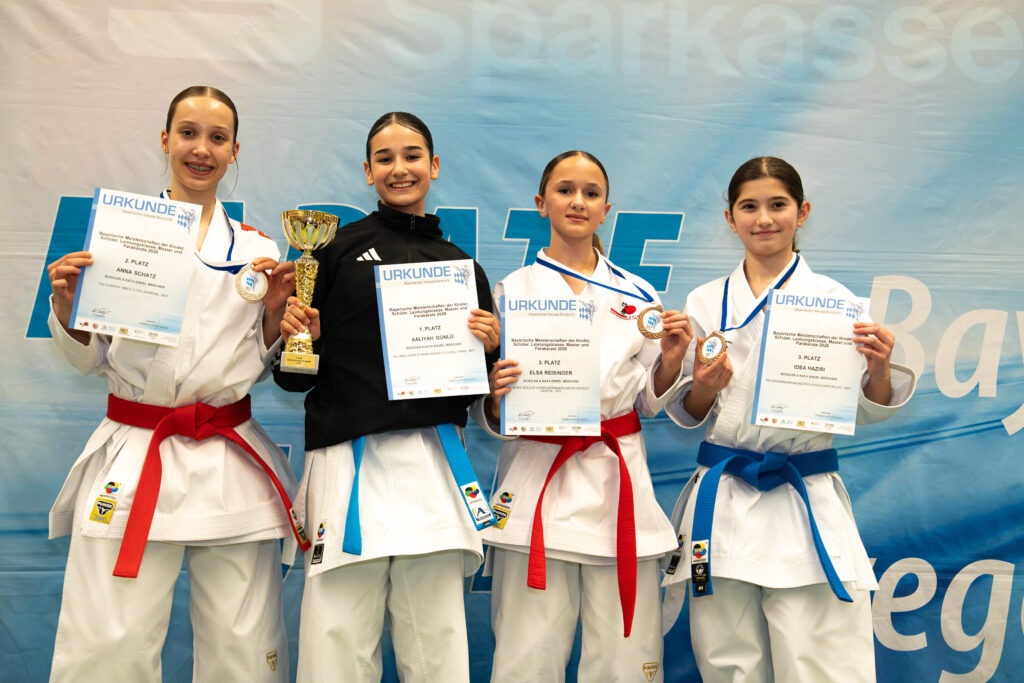 Für die herausragenden Ergebnisse sorgten vor allem die Geschwister Alaara und Aaliyah Günlü. Alaara Günlü (9 Jahre) gewann den bayerischen Meistertitel in der Kategorie Kata Kinder A (8-9 J.) weiblich. Zudem holte sie gemeinsam mit Emily Reichelt (8 Jahre) und Antonia Münch (8 Jahre) Gold im Kata Team Kinder. Damit steuerte sie zwei Landestitel zum Gesamtergebnis bei.
